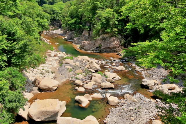 名取川に浸食された峡谷として有名なのが磊々峡です。「時雨滝(しぐれたき)」「天斧巌(てんおのいわ)」「八間巌(はちけんいわ)」などの見どころが知られています。木々の緑と渓谷の岩が織りなす姿は絶景です。